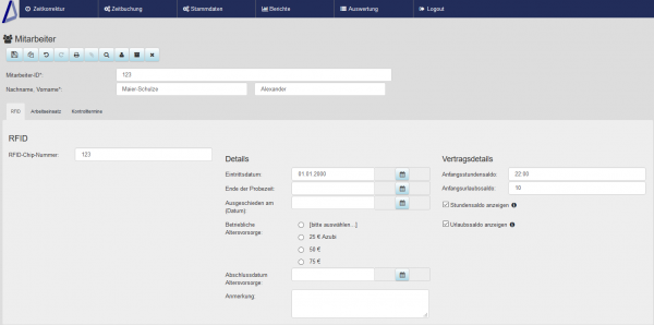 - einer webbasierten Benutzeroberfläche (das "Back-end"). Dort können die MitarbeiterInnen der Buchhaltung die Mitarbeiter-Stammdaten einpflegen, Arbeitszeitkorrekturen durchführen sowie Fehl- und Krankheitstage eintragen. Zudem kann der Mitarbeiter-Monatsbericht für jeden Mitarbeiter eingesehen werden. Aus dem Mitarbeiter-Monatsbericht können direkt Fehltage nachgetragen werden, Überstunden genehmigt werden und Arbeitszeiten korrigiert werden.